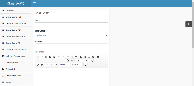 Padabagian backend atauhalaman admin kitaakan di beriaksesuntukmelakukanpengelolaan data sepertimenginputdata kategori game dan cheat game