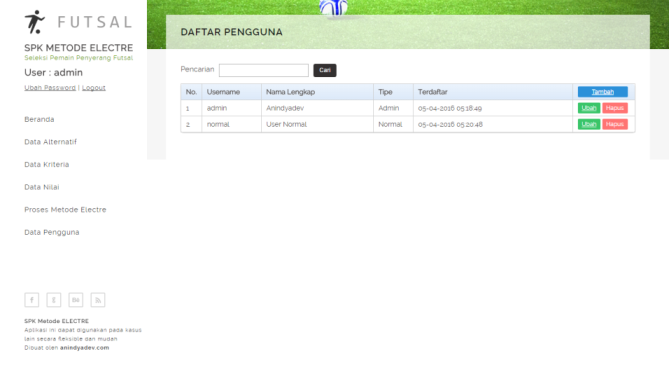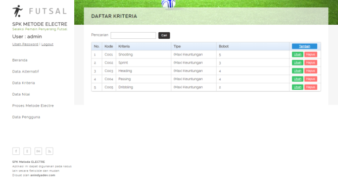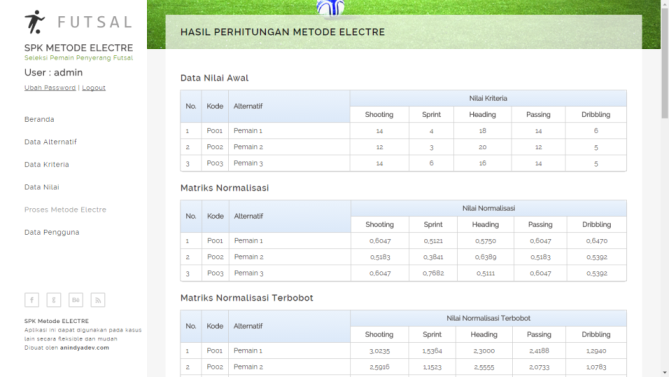 Aplikasi SPK ini dibangun untuk kasus Seleksi Pemain Penyerang Futsal menggunakan Metode ELECTRE, akan tetapi Aplikasi ini dapat digunakan pada kasus lain secara fleksible dan mudah, dikarenakan pembuatan tabel dan kolom pada database bersifat umum dan krirteria dapat diubah secara dinamis.