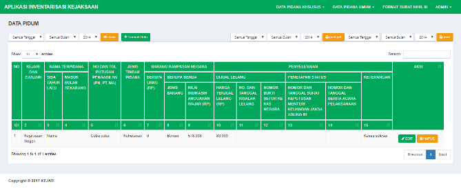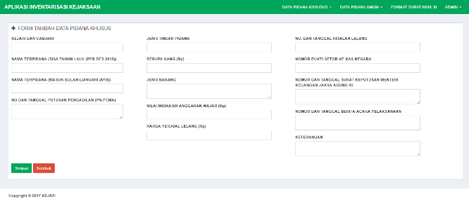 Padabagian backend atauhalaman admin kitaakan di beriaksesuntukmelakukanpengelolaan data sepertiinventarisbarangpadakejaksaan. Aplikasiinimemuat file excel yang biasadikerjaakansecara manual, disini user admin tinggalmenginputkan data makaakandapat di cetakke excel sesuaidengan format yang ada