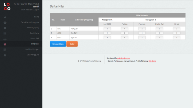 Aplikasi SPK ini dibangun untuk kasus Penilaian Kesamaptaan menggunakan Metode Profile Matching, akan tetapi Aplikasi ini dapat digunakan pada kasus lain secara fleksible dan mudah, dikarenakan pembuatan tabel dan kolom pada database bersifat umum dan krirteria dapat diubah secara dinamis.